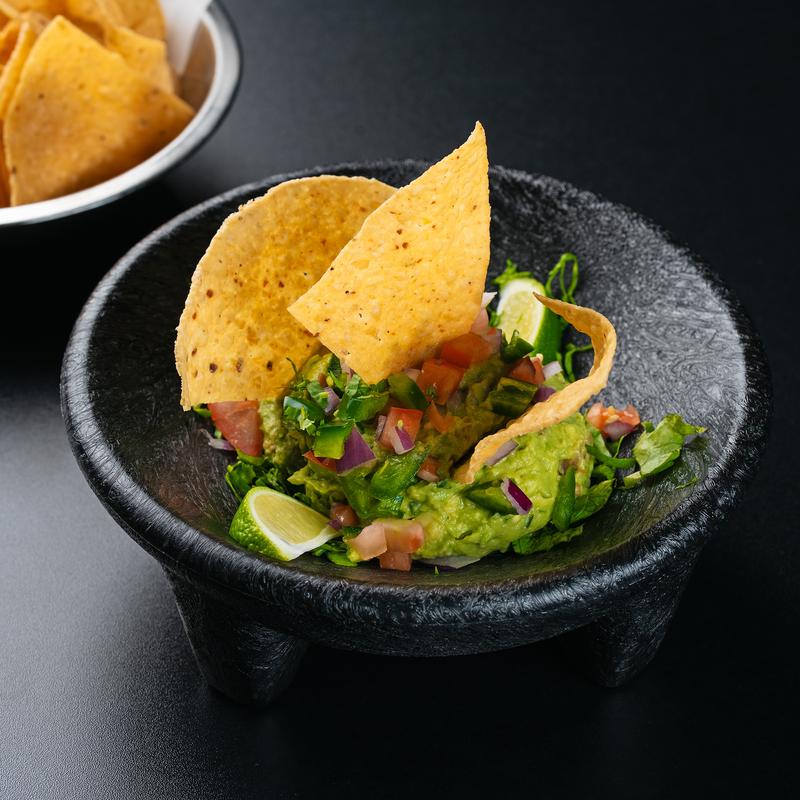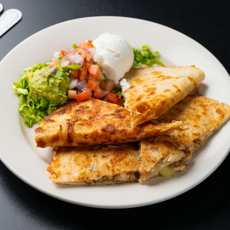With guacamole con pico de gallo and sour cream, mozzarella cheese