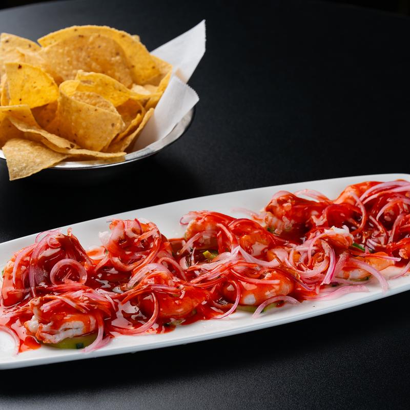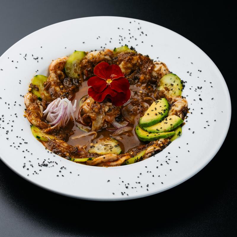 Cooked on lime with our blend of red chiles, cucumber and red onions and squid ink