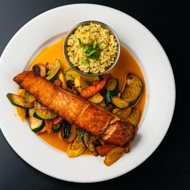Butter and herbs grilled salmon with sauteed veggies and rice