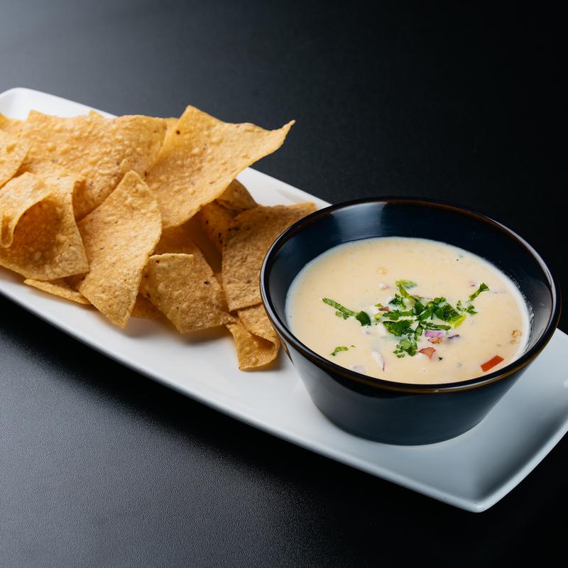 Chips with refried beans, white gueso & choice of meat & guacamole
